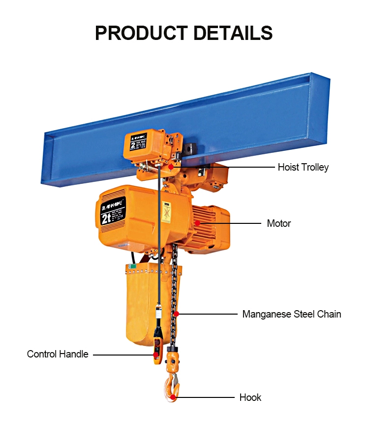 Elektrický řetěz Kladkostrý kladkostrý je lehké a malé zvedací zařízení. Elektrický řetězový kladkostraj se skládá z elektromotoru, převodového mechanismu a řetězového kola. Elektrický řetězový kladkostrál je vyráběn v souladu s mezinárodními normami. Tělo je krásné a